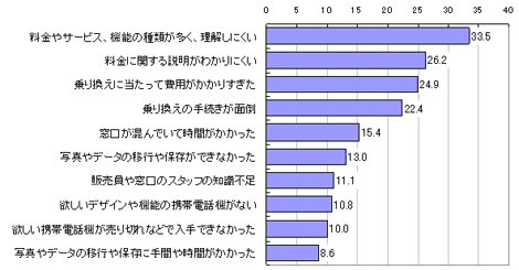 3社全体で「携帯の変更(乗り換え)にあたって、不満を感じたもの」として最も多かったのは、「料金やサービス、機能の種類が多く、理解しにくい」という回答で、全体の33.5%にも及びました。また、「料金に対する説明がわかりにくい」という回答も26.2%ありました。MNP制度を期に始まった携帯電話各社の新料金プランの導入や、相次ぐ新サービス・新機種の投入は、結果として一部の消費者には利益をもたらしているものの、内容や機能がまだ十分に理解され浸透していないことが伺え、携帯電話各社には「わかりやすい料金と情報発信」を強く望む人が多いようです。