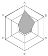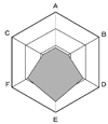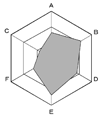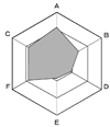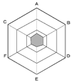 F 下の六角形のチャートに、A〜Gの各合計点をプロットし、それを直線で結びます。作成した六角形があなたの地域の戦略の状況になります。頂点が低い(中心に近い)ところほど取り組みが弱いことを意味しています。 下にある6つの例を元に、あなたの地域の戦略のタイプを見つけてください。そこに書いてある内容が、今後取り組むべき地域ブランド戦略の方向性になります。