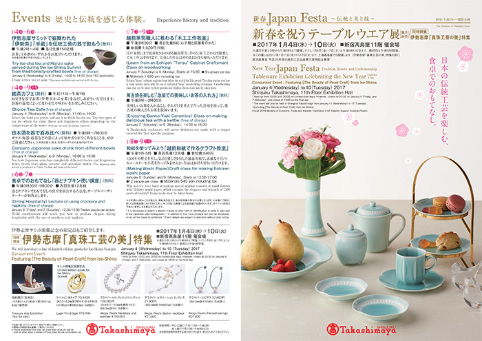 世界中から注目されている日本の伝統的工芸品。 栃木県、福井県、三重県、佐賀県の4件にスポットを当てて、新春のテーブルコーディネートを楽しむイベントを、平成29年1月4日(水)から10日(火)まで、新宿高島屋11階催事場で開催される(経済産業省「平成28年度伝統的工芸品産業支援補助金」を活用して実施します。 会場では、3人のテーブルコーディネーター(小林美紀、上木恵美子、上木美枝)によるテーブルコーディネートの展示が行われるほか、新春をテーマに新たに商品化したテーブルウェアのテスト販売などが行われます。